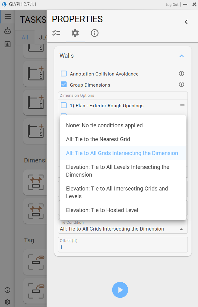 When Setting up a task and selecting Tie to All Grids Intersecting the dimension what we expected to happen was for the dimension string to be tied back to all grid lines. However, in our testing it seems to not be tying back to any of the gridlines, image below. We think there could possibly be a bug preventing the task from running as expected.