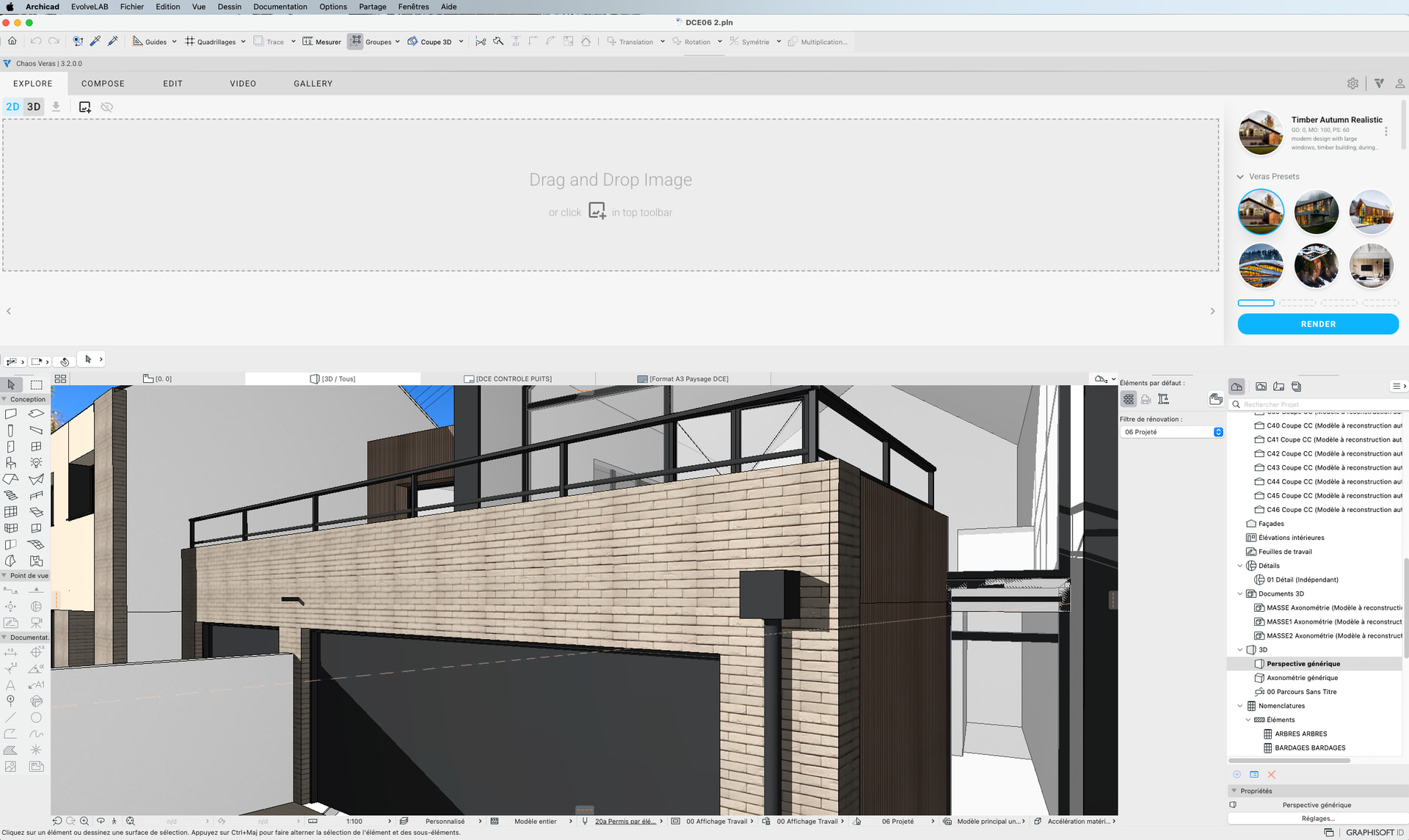 I can run renders, but the workflow feels disconnected from the Archicad 3D view, with a visible “Drag and Drop Image” state similar to the web UI.