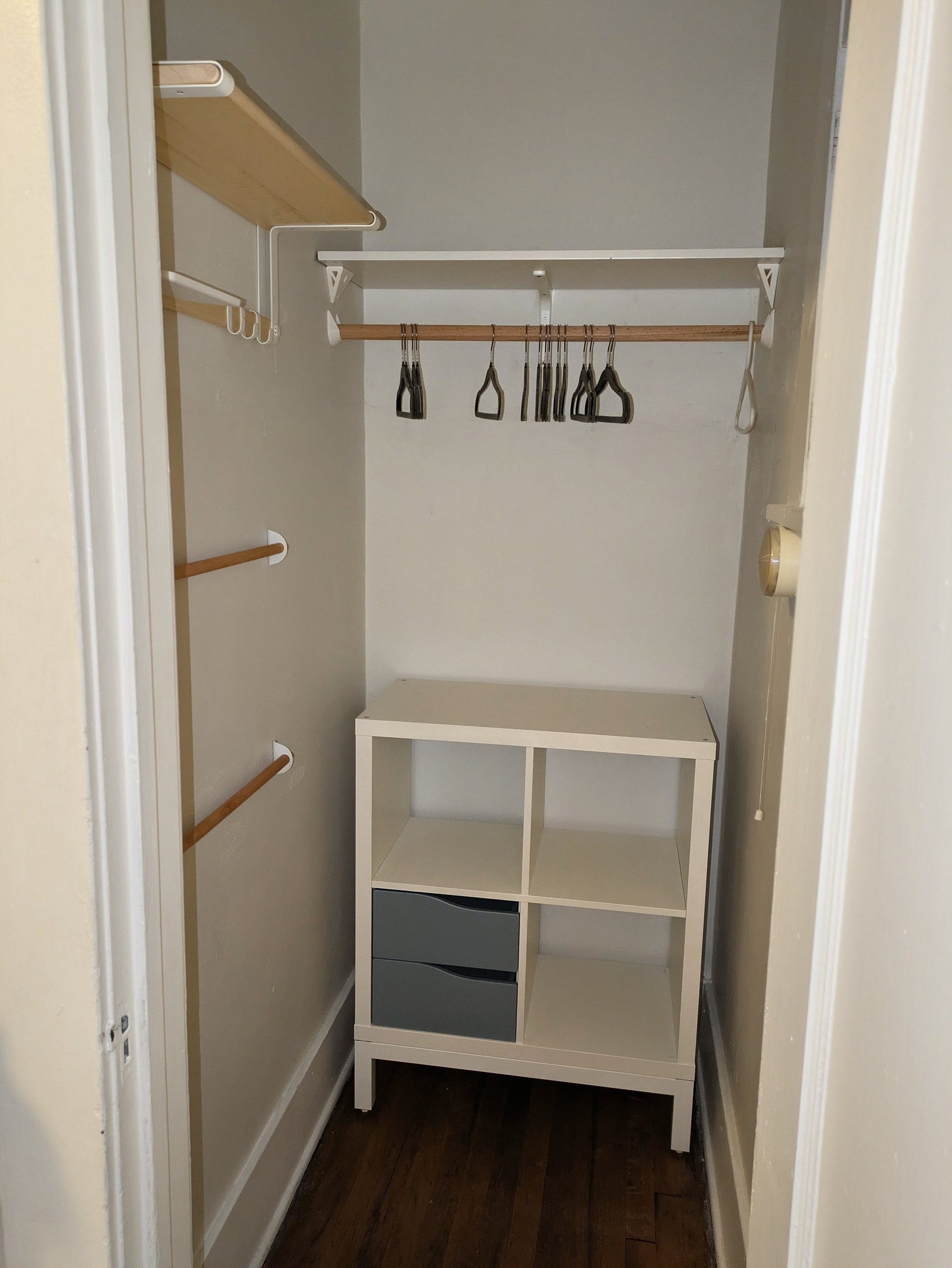 Our home’s second bedroom, which we are gonna use as the nursery, has a small closet (~ 3’ x 4’) that had only one jenky plywood shelf and bent metal clothes hanger bar, courtesy of the previous owner.