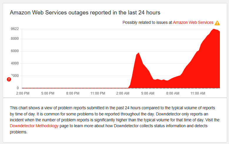 There’s a AWS outage and service degradation. However it’s now recovering, per AWS: https://health.aws.amazon.com/health/status