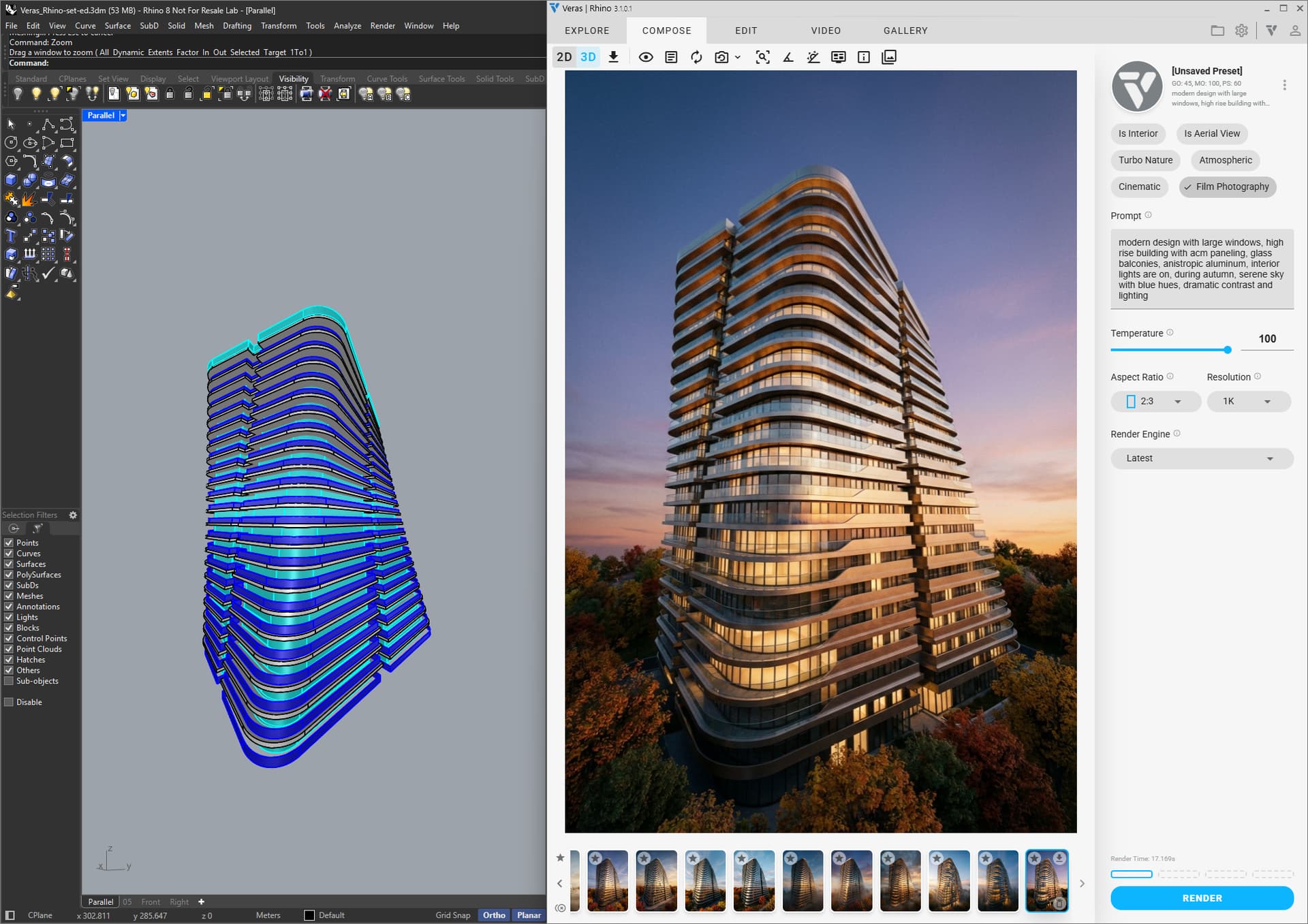 I am using Veras for Rhino 1.6.4.6, with ‘Geometry Override’ set between 10 and 0 to achieve photorealistic effect and preserve geometry details (curtain wall mullions and railings). My Rhino model is imported directly from Revit via Rhino.Inside (slabs, curtain walls and railings).