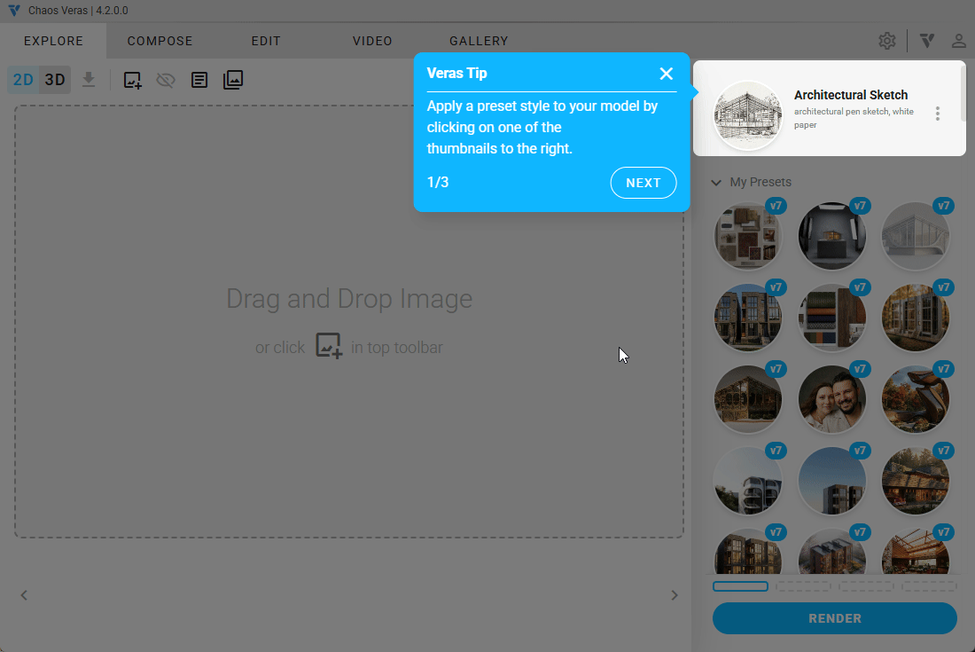 Quickly apply and explore visual styles with the new Custom Style Chips — prompt-assist tags that let you dial in the look and feel of your render with a single click. Create your own prompt snippets and customize the UI for quick access to steering the output toward a specific aesthetic.