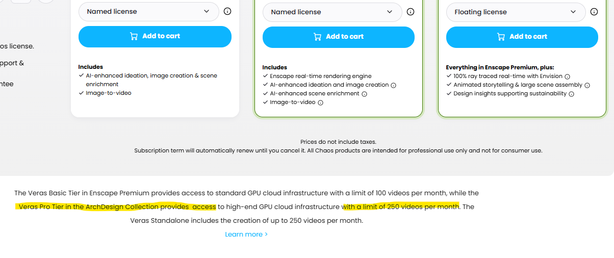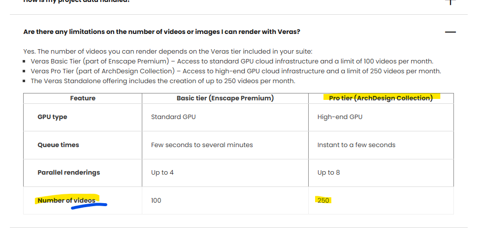 Just purchased two Pro tier (ArchDesign Collection) licenses. I wanted to test out Veras Video feature, I did a few quick test renders. Now I see that I’m almost at my limit for the month??